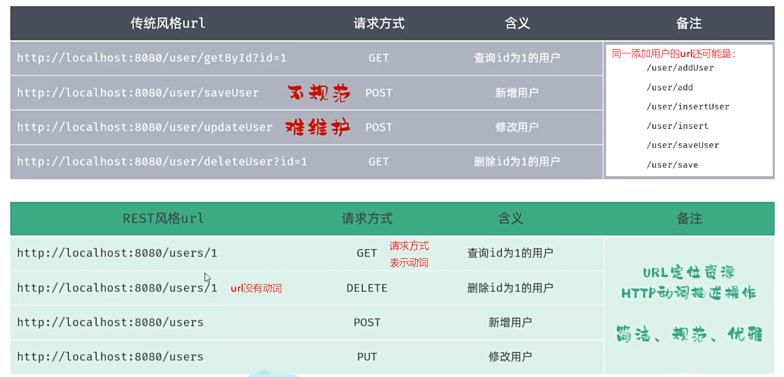 | http://localhost:8080/users/1 | GET      | 查询id为1的用户 |