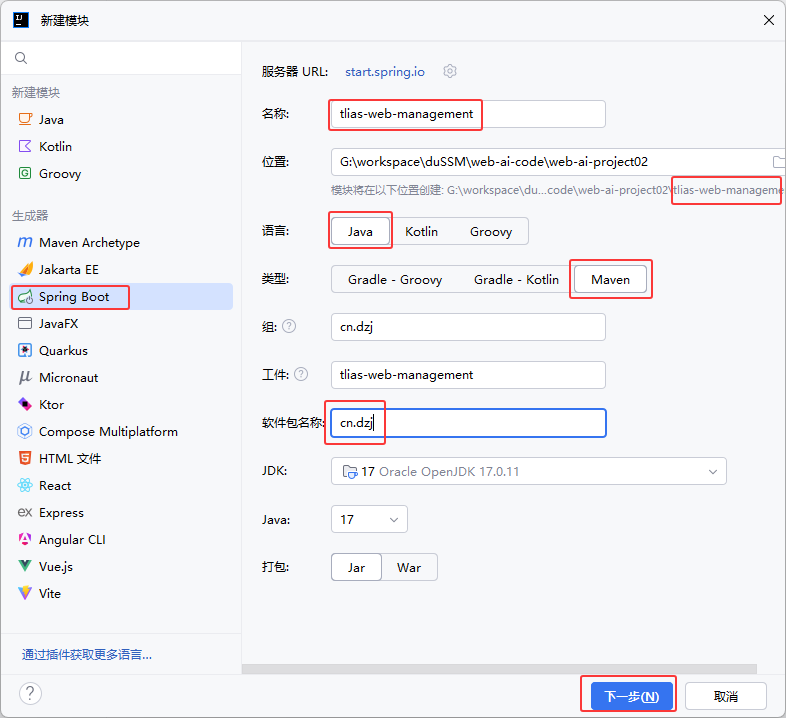 <figure><img src="/AiJavaWeb/imgs/jwai07-17.png"><figcaption>图17 创建Springboot新模块①</figcaption></figure>