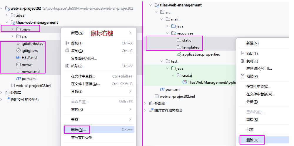 <figure><img src="/AiJavaWeb/imgs/jwai07-19.png"><figcaption>图19 删除Springboot模块中多余的配置文件和两个静态目录</figcaption></figure>