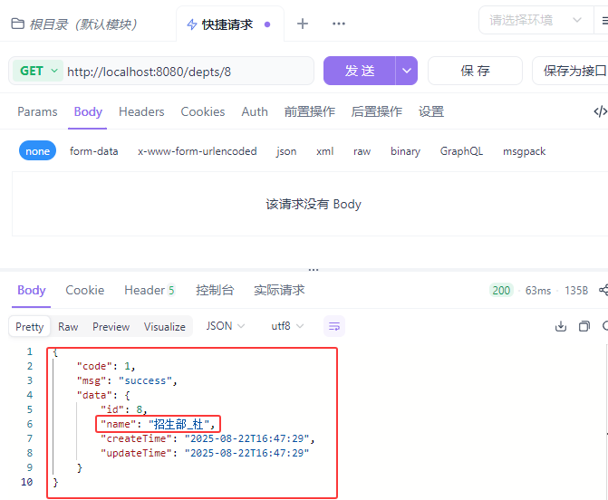 | http://localhost:8080/user/getById?id=1    | GET      | 查询id为1的用户 |