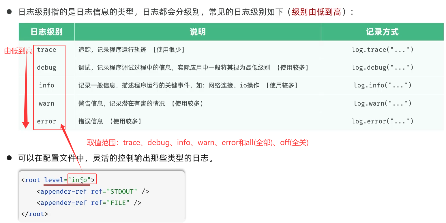 | **日志级别** | **说明**                                                     | **记录方式**     |