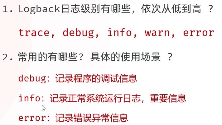 | info         | 记录一般信息，描述程序运行的关键事件，如：网络连接、io操作 【使用较多】 | log.info("...")  |
