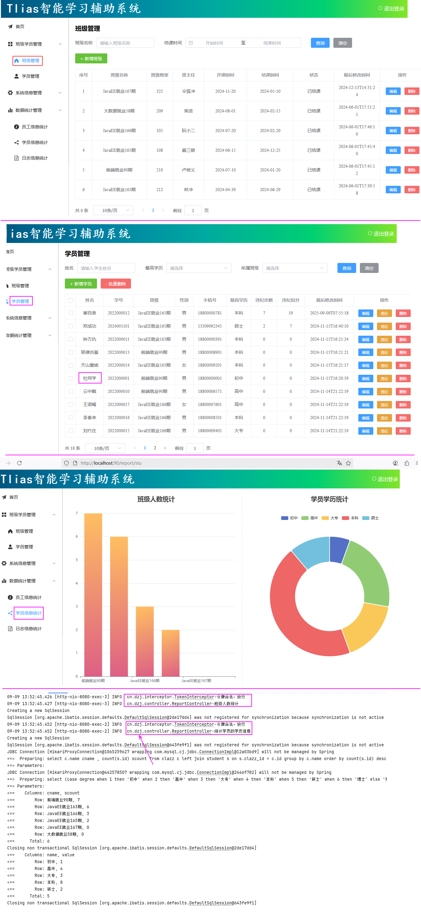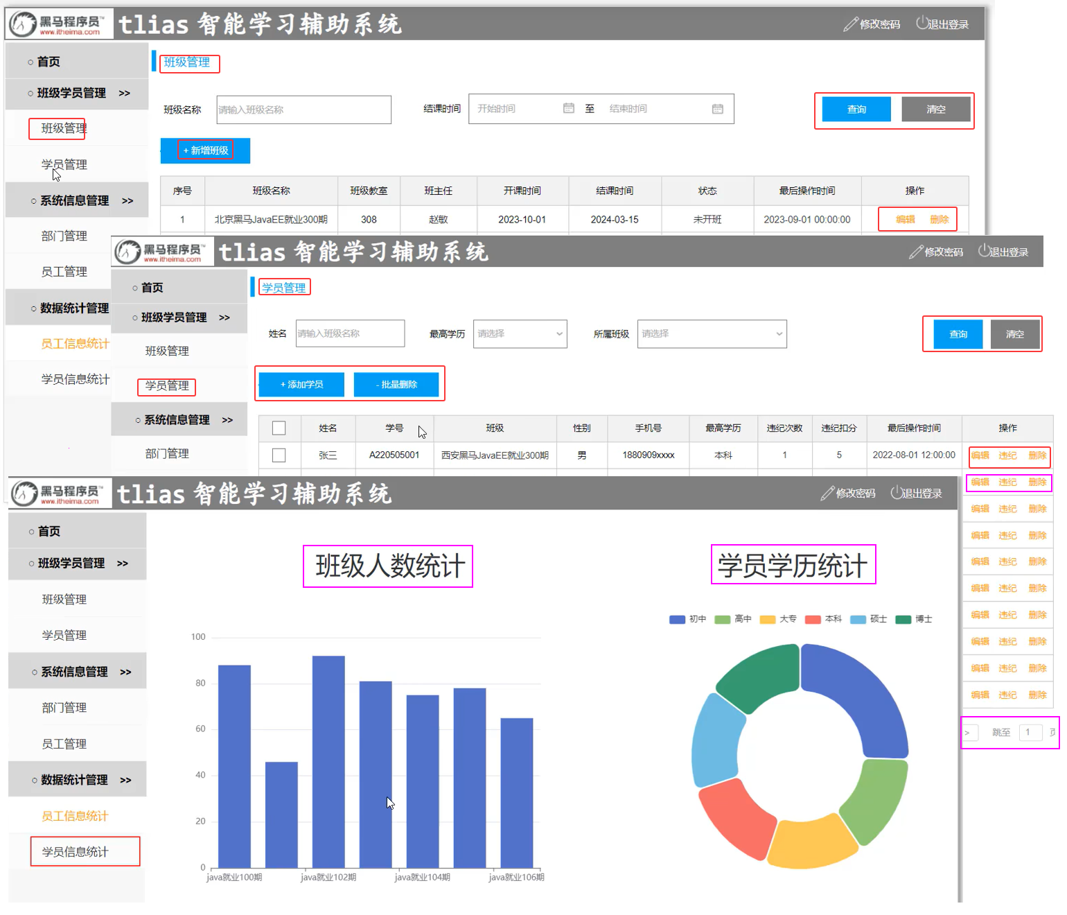 * 数据统计：班级人数统计、学员学历统计。