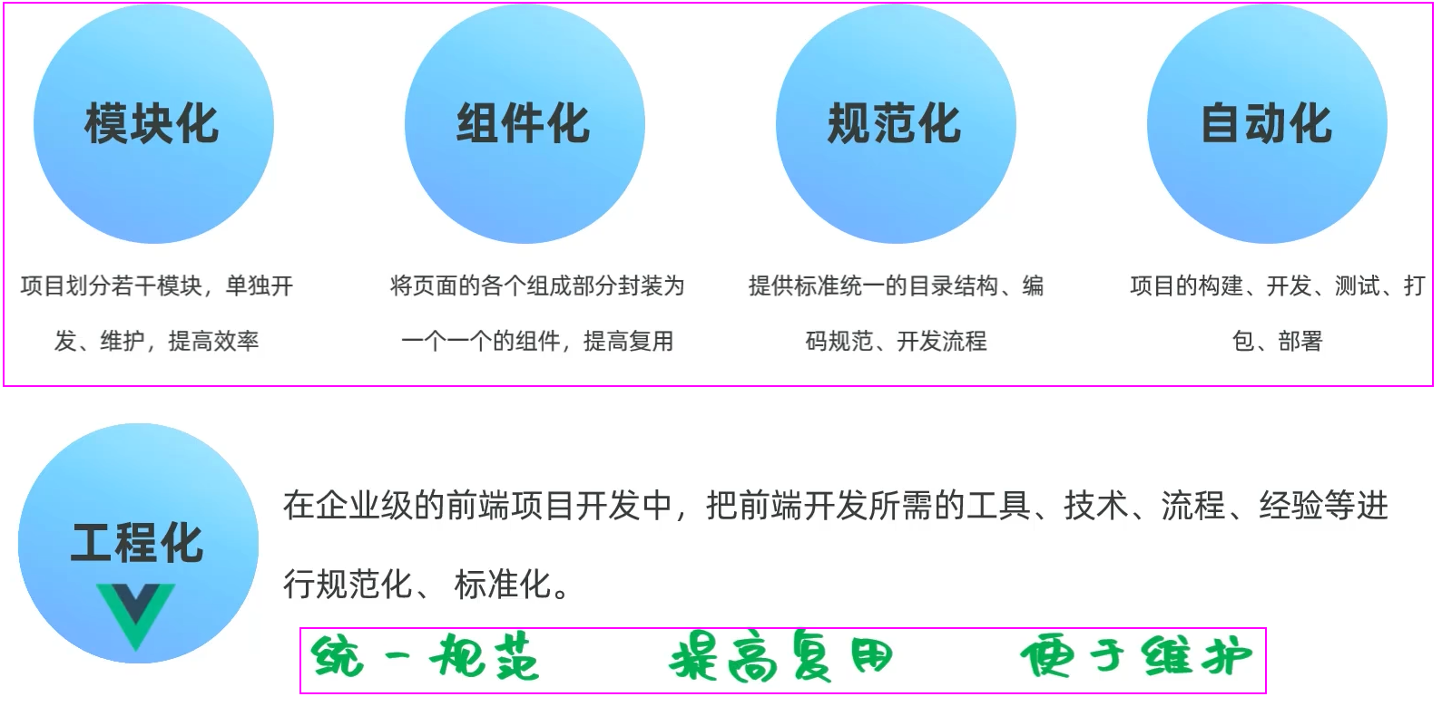 * 工程化：(模块化、组件化、规范化、自动化)在企业级的前端项目开发中，把前端开发所需的工具、技术、流程、经验等进行规范化、 标准化。(统一规范、提高复用、便于维护)