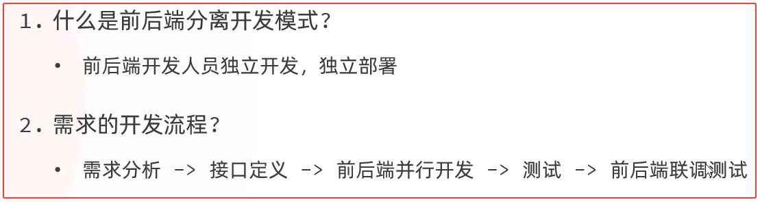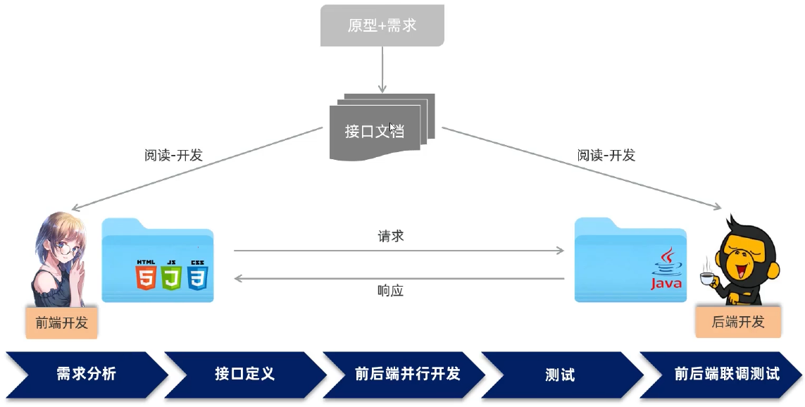 * 需求分析 -> 接口定义 -> 前后端并行开发 -> 测试 -> 前后端联调测试