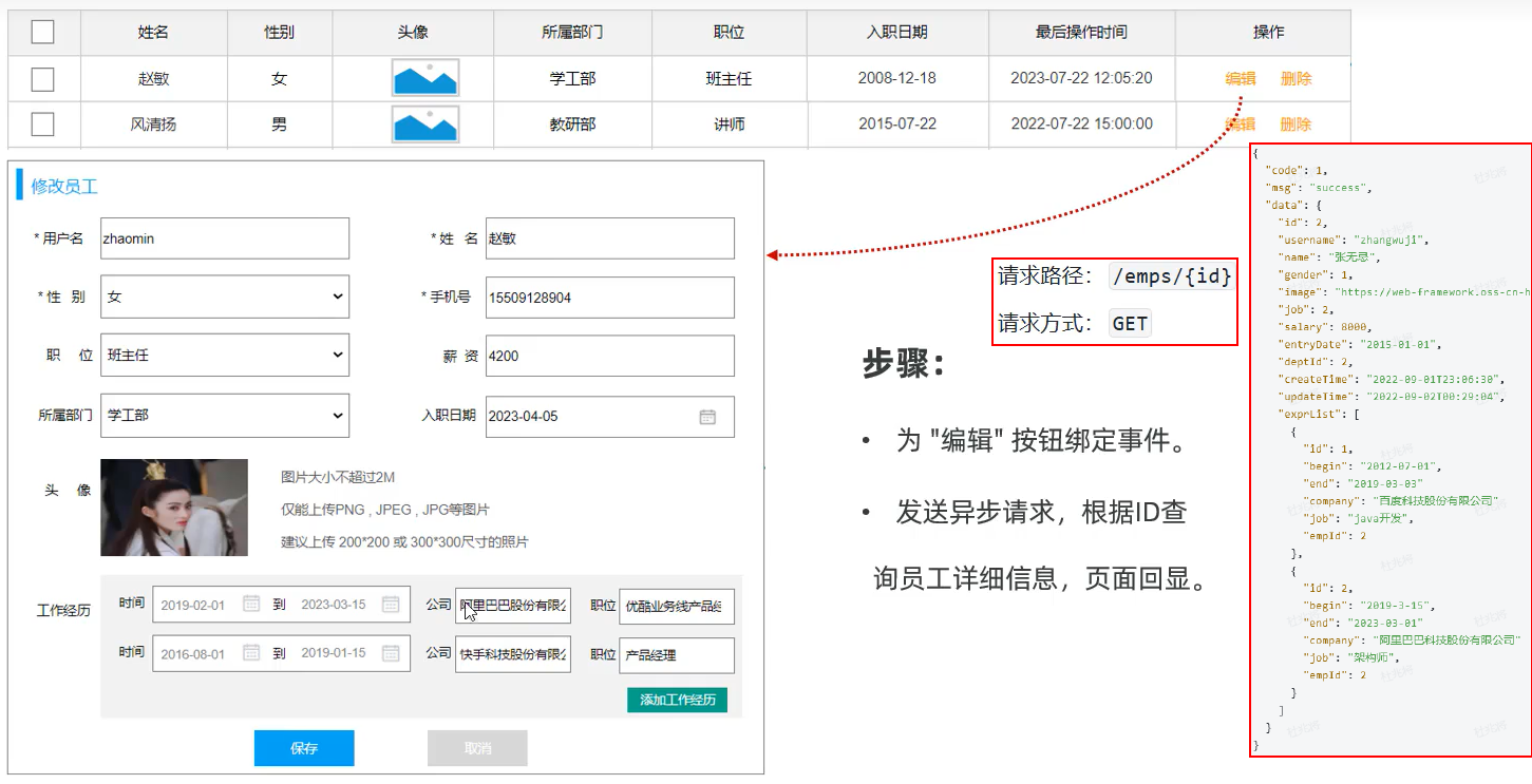 * 点击 “编辑” 按钮，执行根据ID查询员工信息，页面回显。