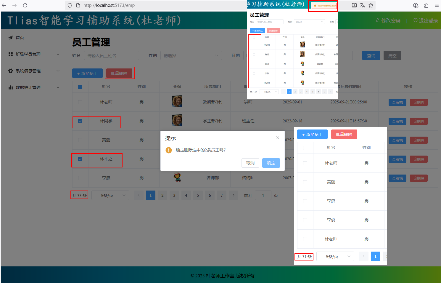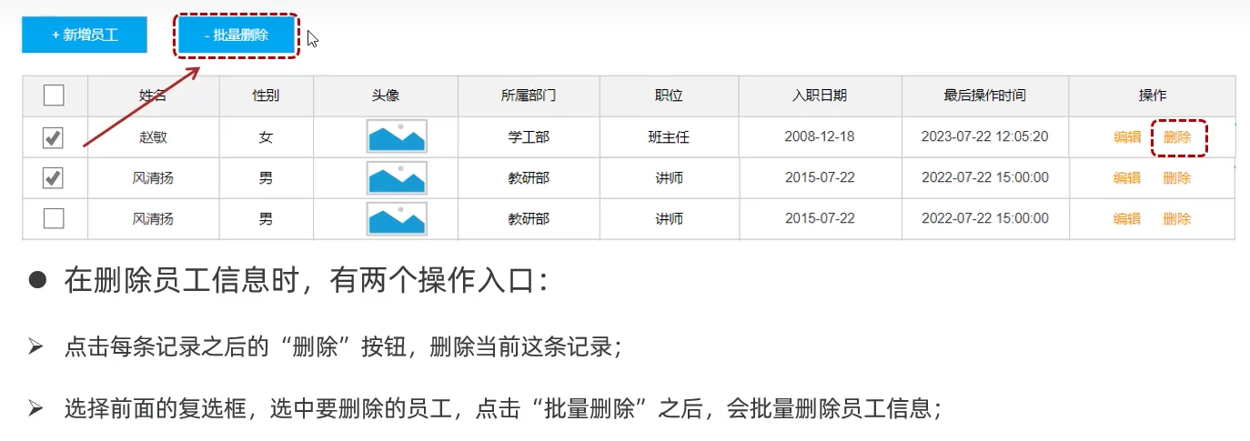 * 选择前面的复选框，选中要删除的员工，点击“批量删除”之后，会批量删除员工信息；