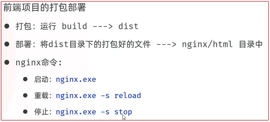 * 部署：将打包好的 dist 目录下的文件，复制到nginx安装目录的html目录下。