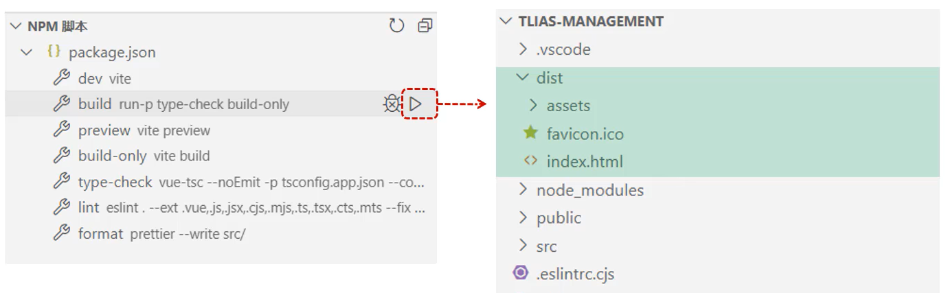 * 打包：运行 build ---> dist