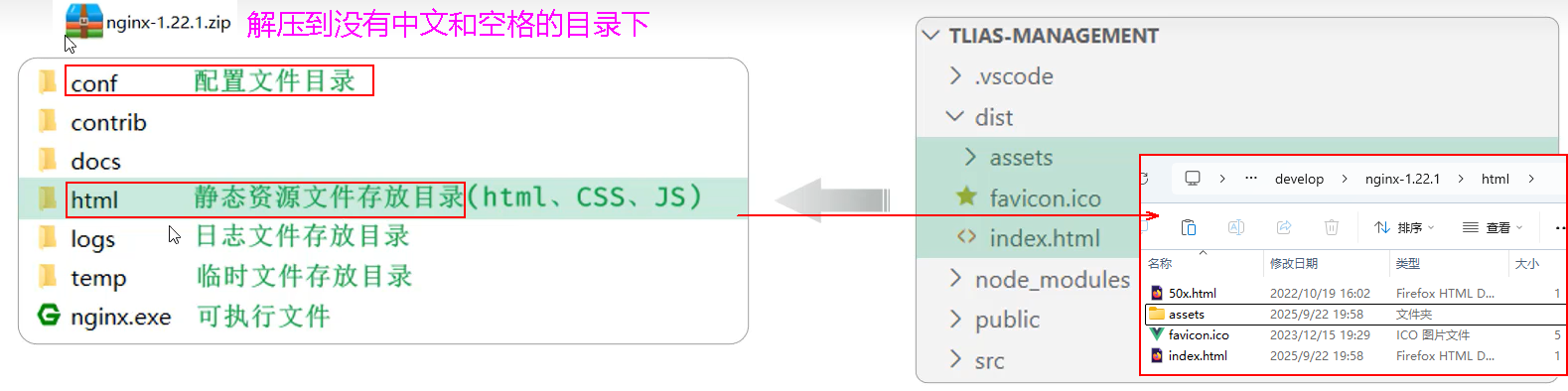 * 部署：将打包好的 dist 目录下的文件，复制到nginx安装目录的html目录下。